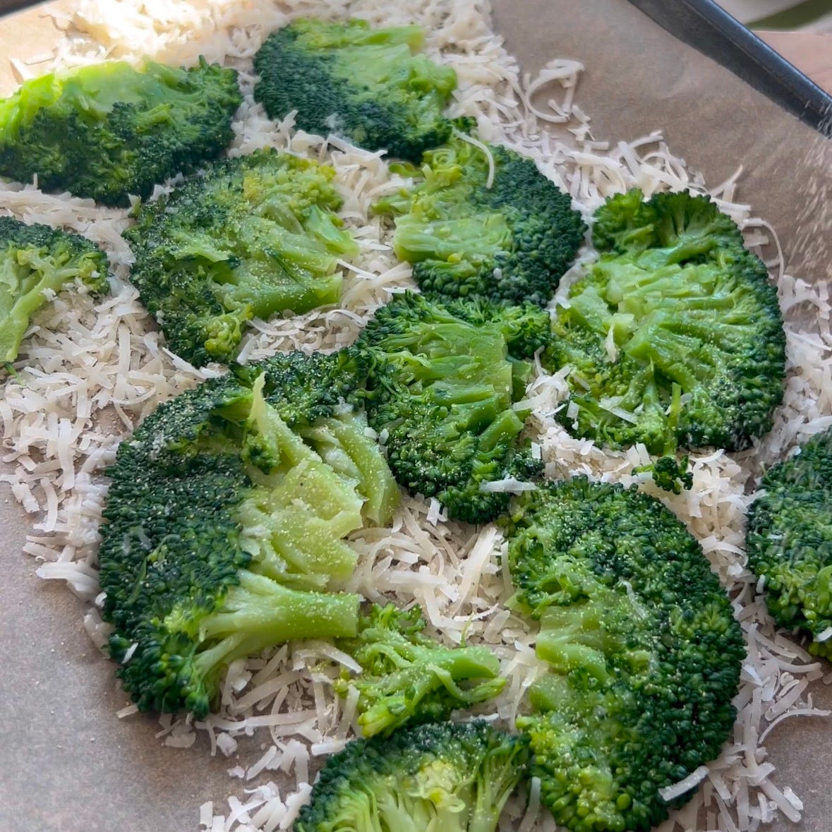 Place each broccoli floret onto the parmesan and “smash” down using a small jar or water glass